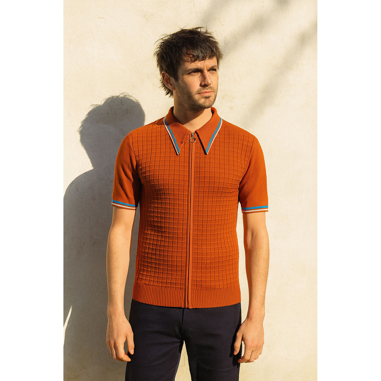 Our ‘Apollo’ is a true retro essential; a long sleeve, zip-through knitted polo that channels the bold spirit of 1970s mod and leisurewear.